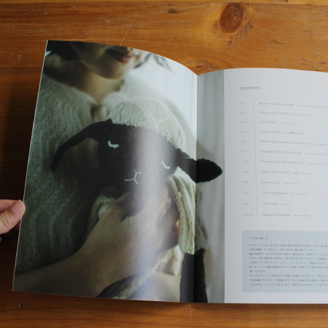 今回のパターンブックでは、編み図(チャート)を挟み込みの別紙に記載。複雑なケーブル模様も段ごとに確認しながら編めるようにしました。