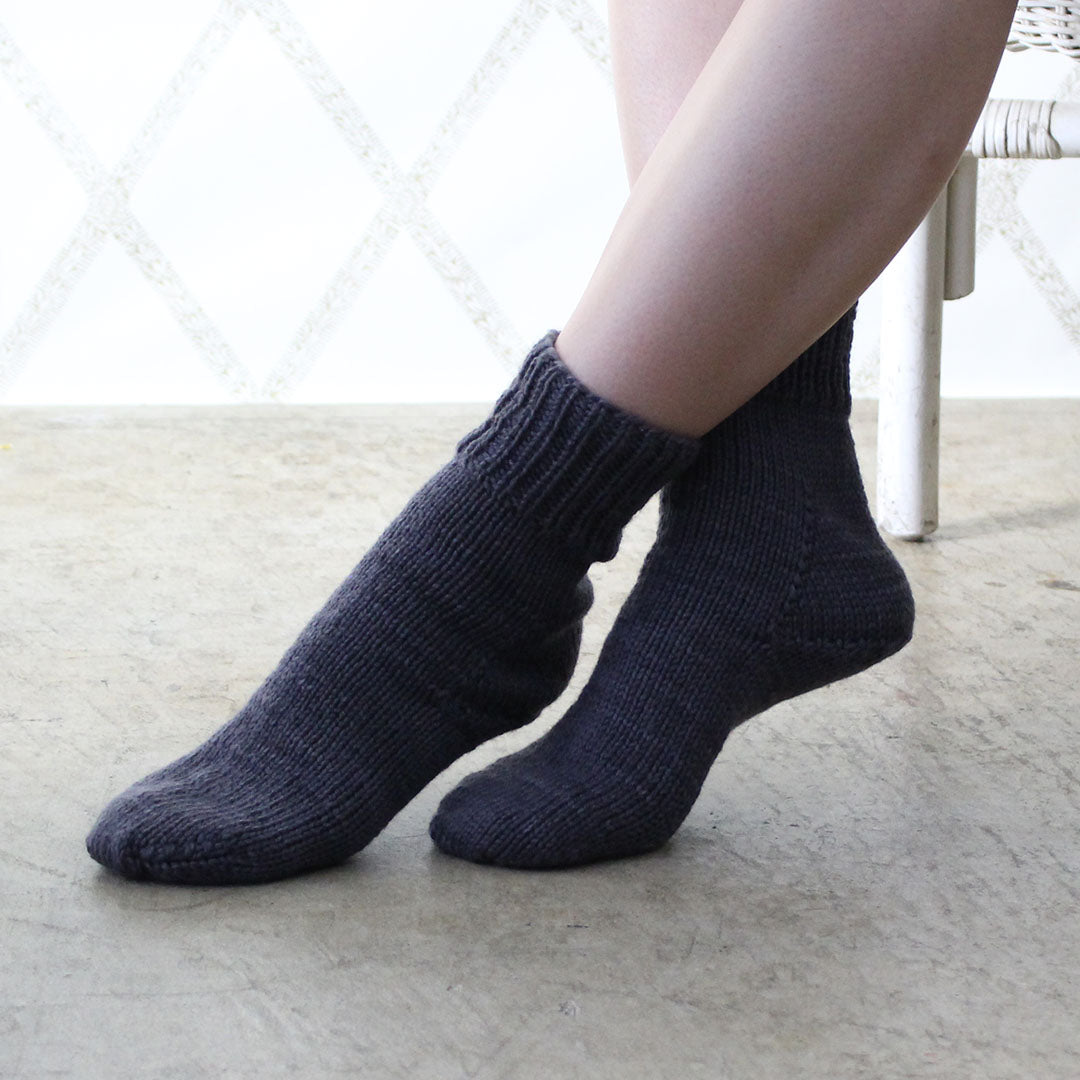 最終章Chapter6は、メリヤス編みのソックスのキットです。はじめてのソックス編みにおすすめのシンプルなパターンではありますが、長めのリブとゆったりしたかかとの履きやすいデザインに仕上がりました。