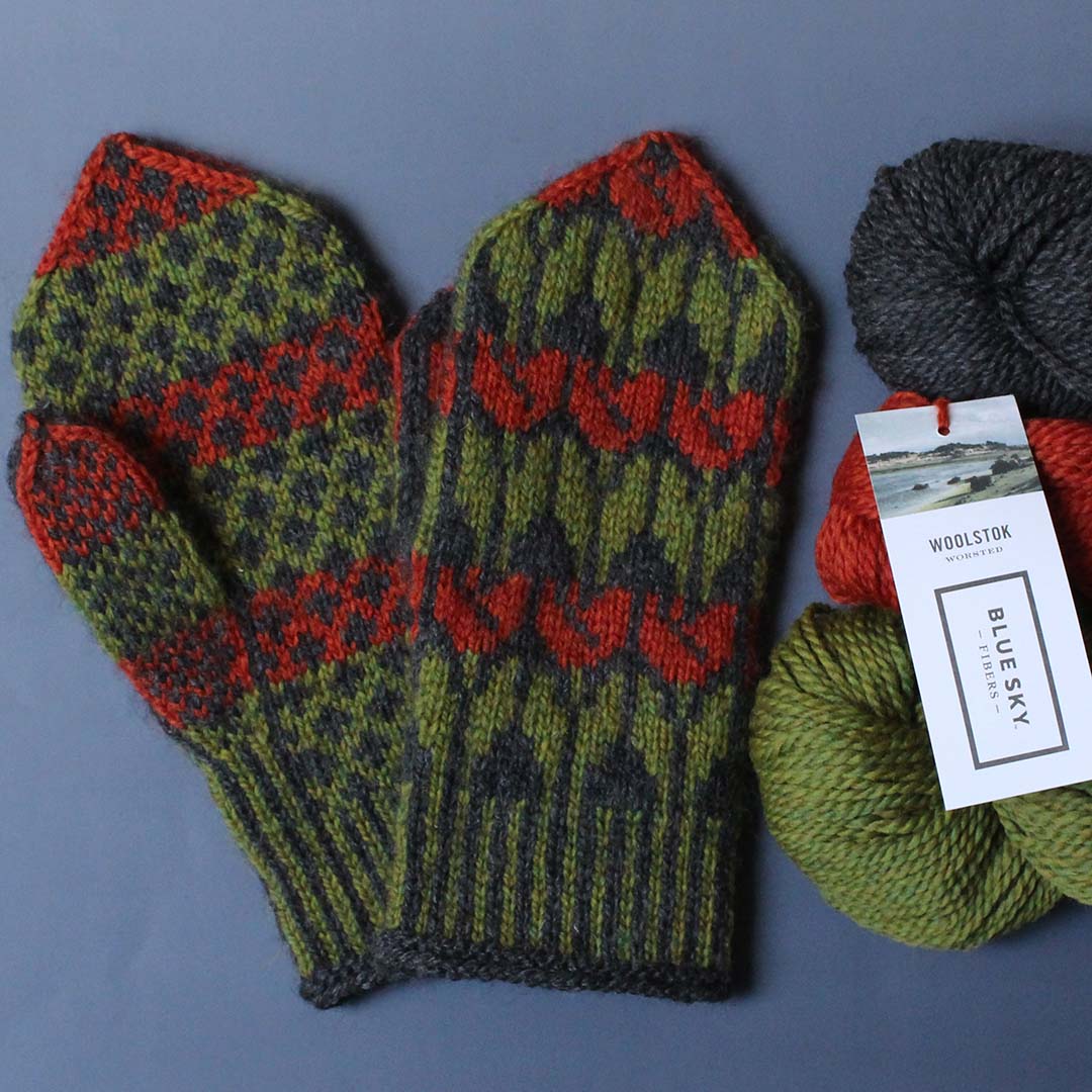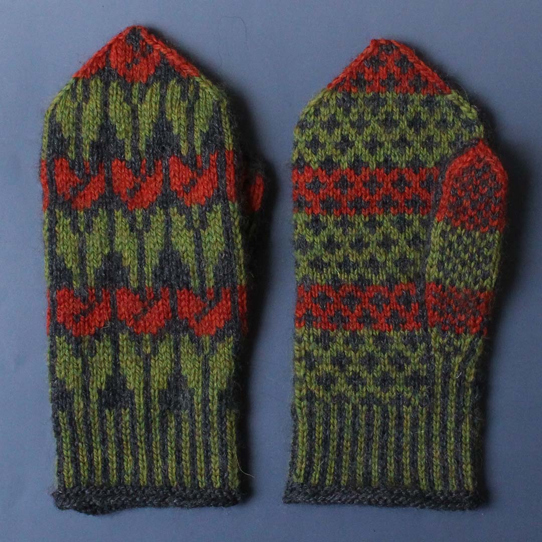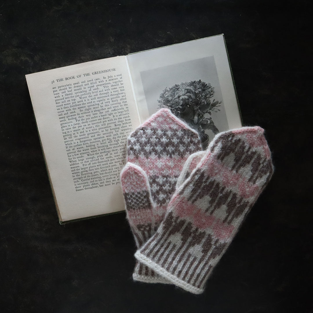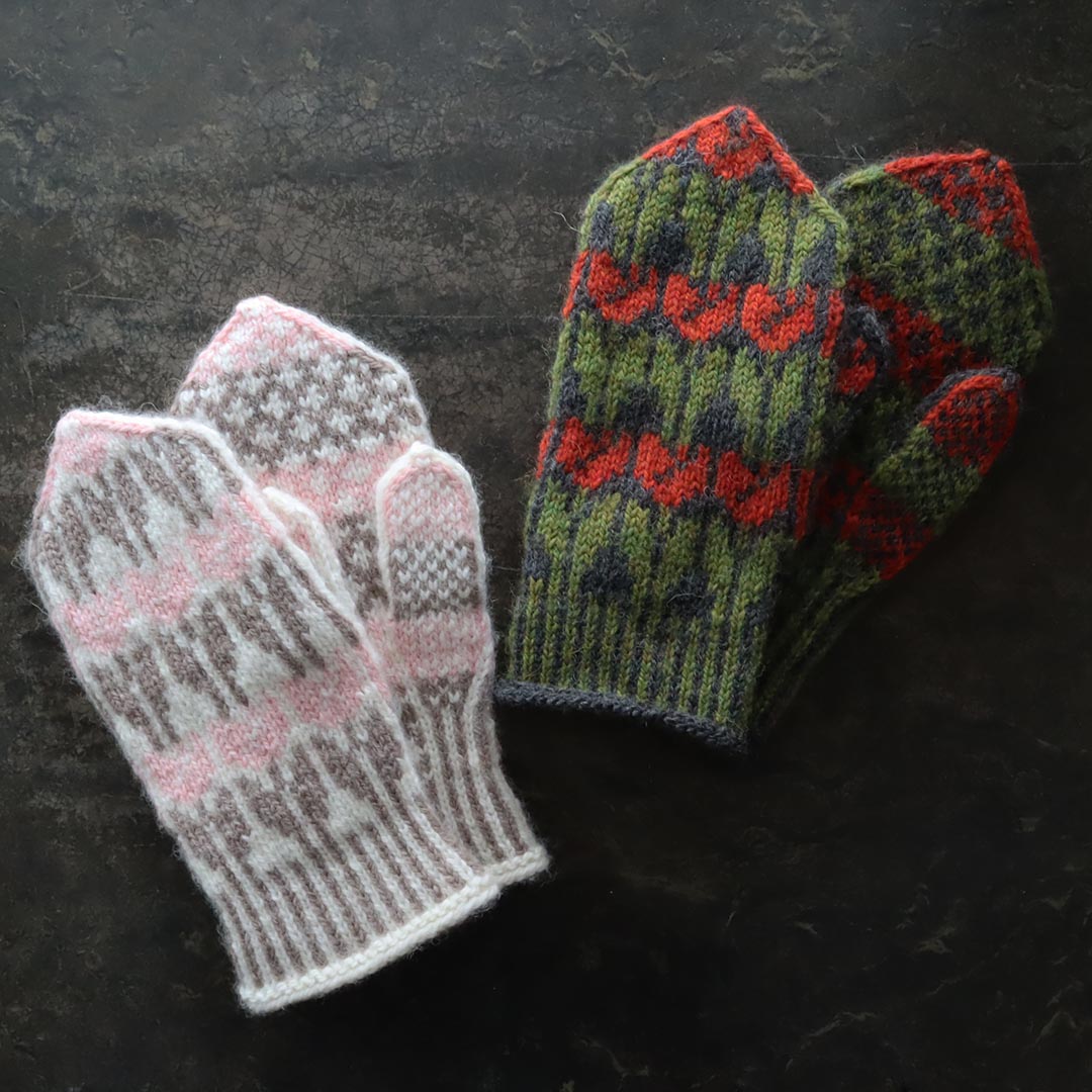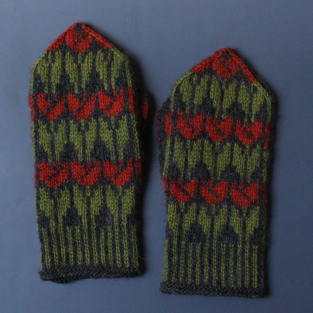 北欧の伝統柄をアレンジした、チューリップの編み込み模様のミトン。愛らしい模様を大人っぽいカラーでまとめました。