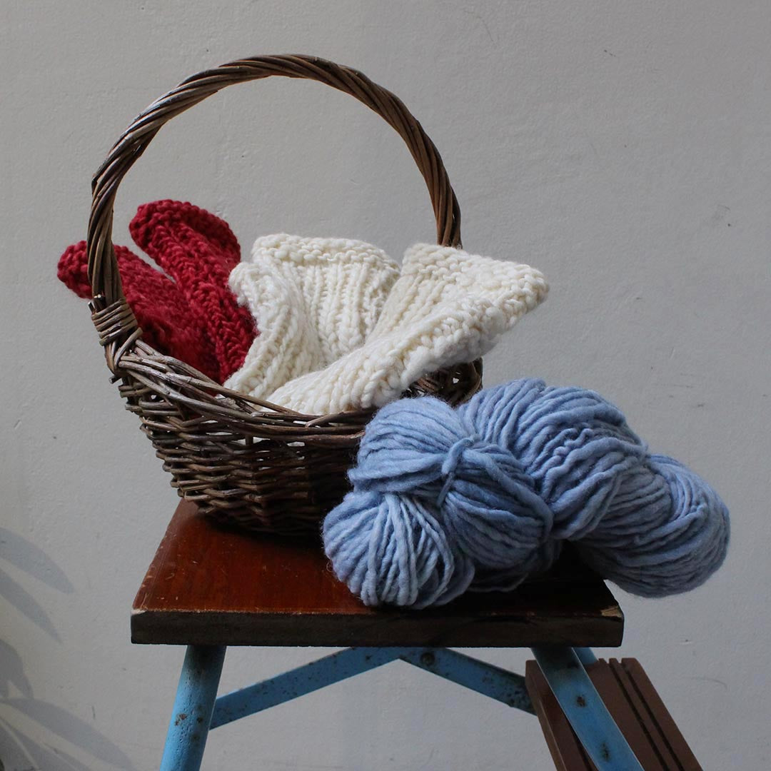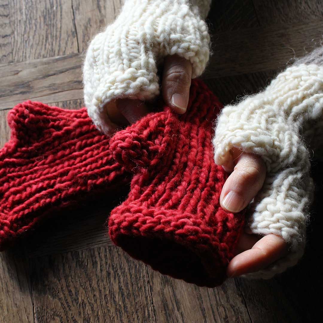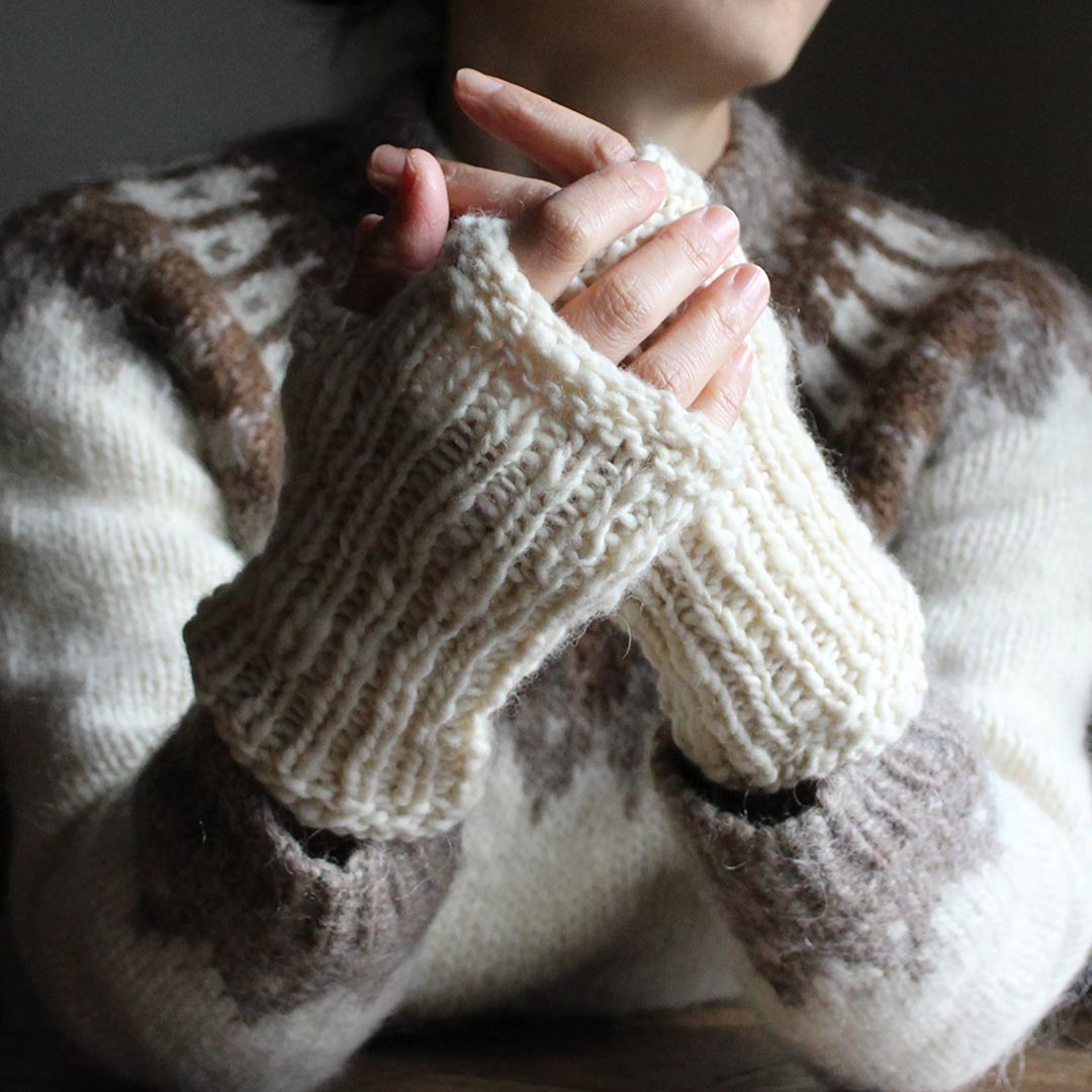 やわらかなコリデールの原毛を手紡ぎしたウール糸「クラシカ」でざくざくと編む、フィンガーレスグローブです。