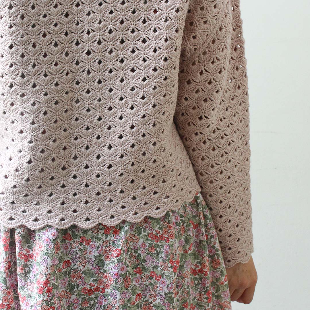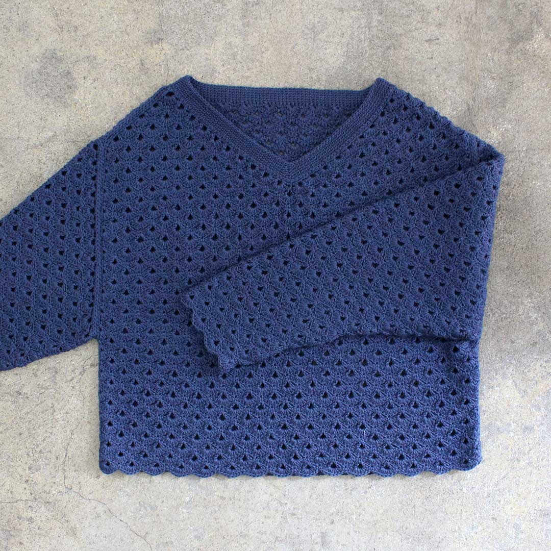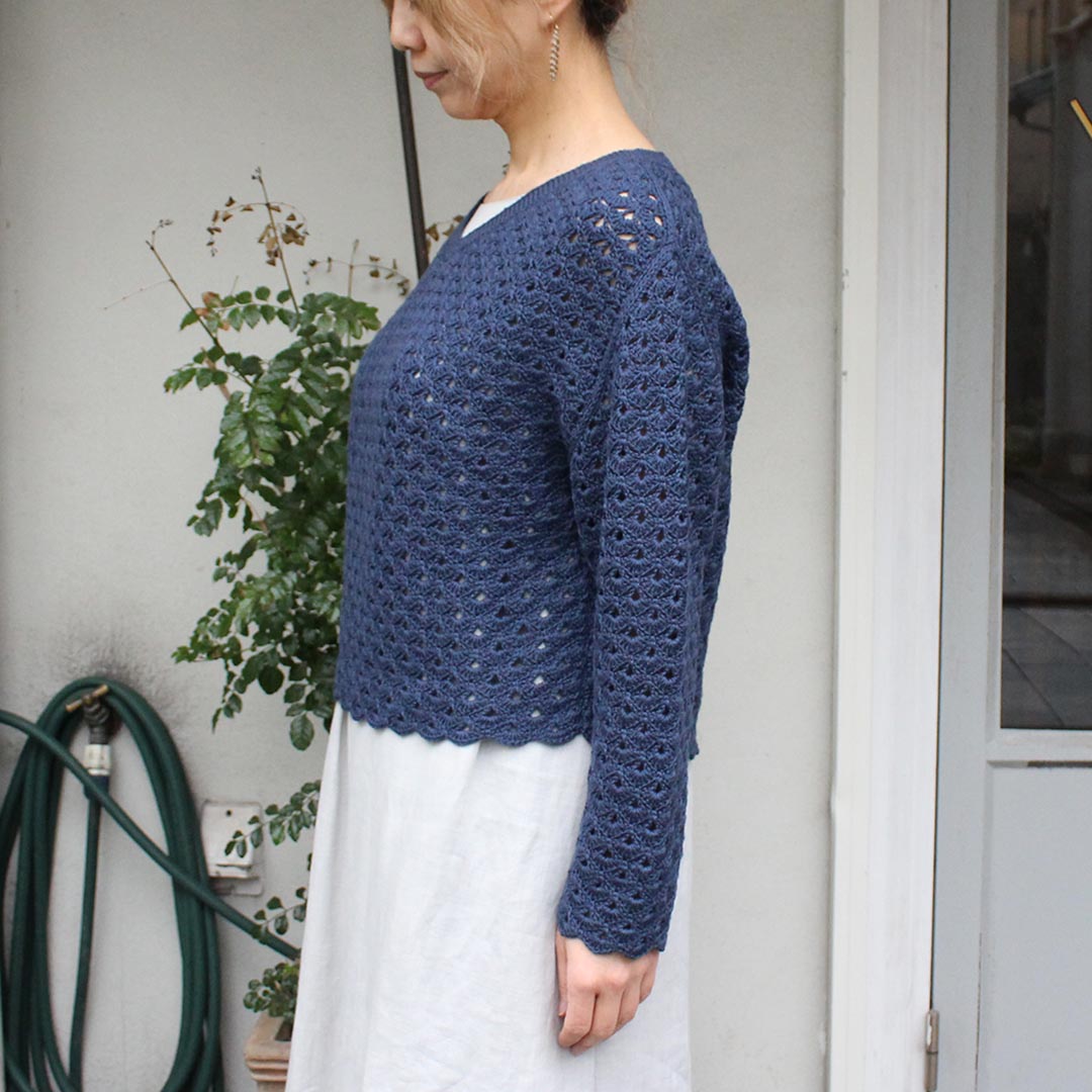 ウロコが並んだような地模様の、かぎ針編みのプルオーバーを編むキットです。