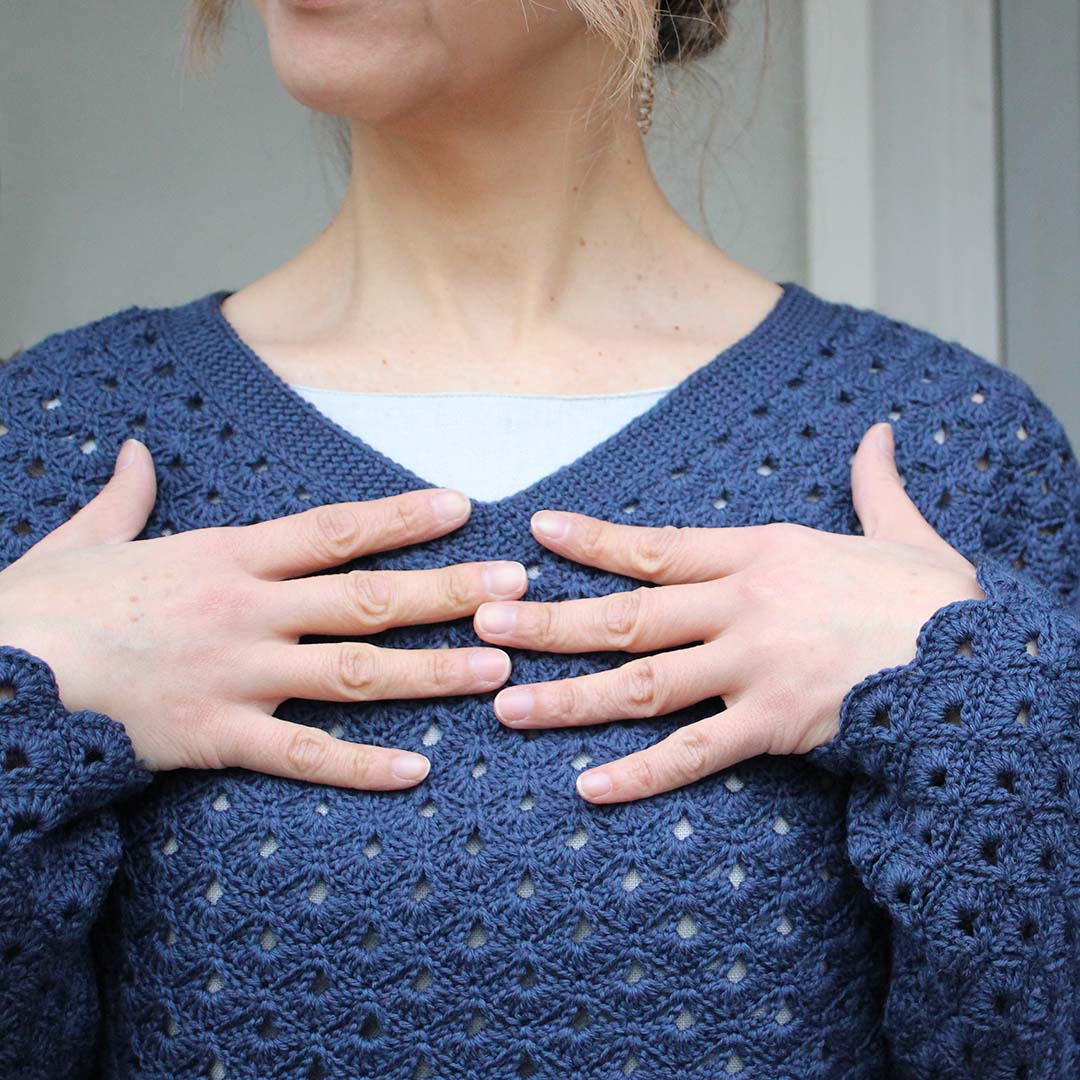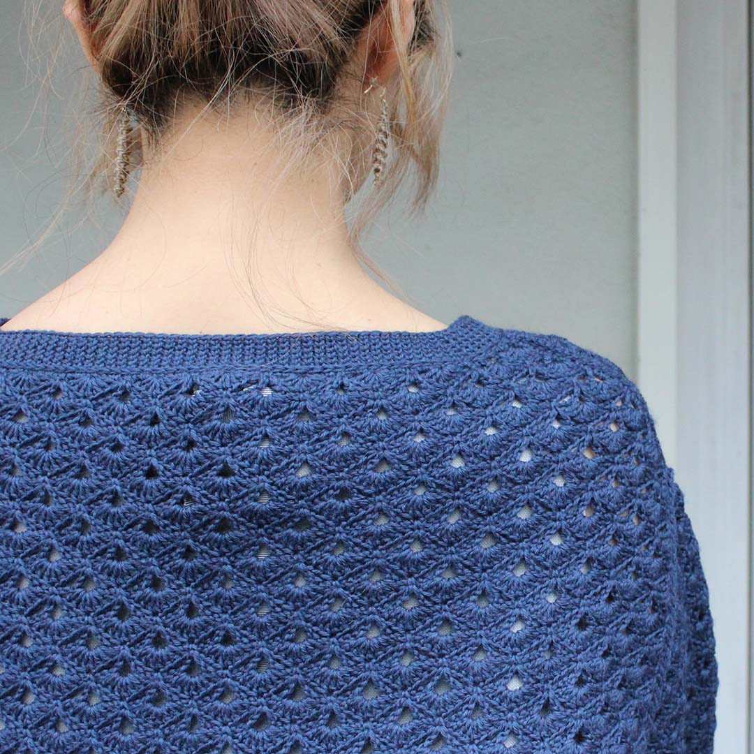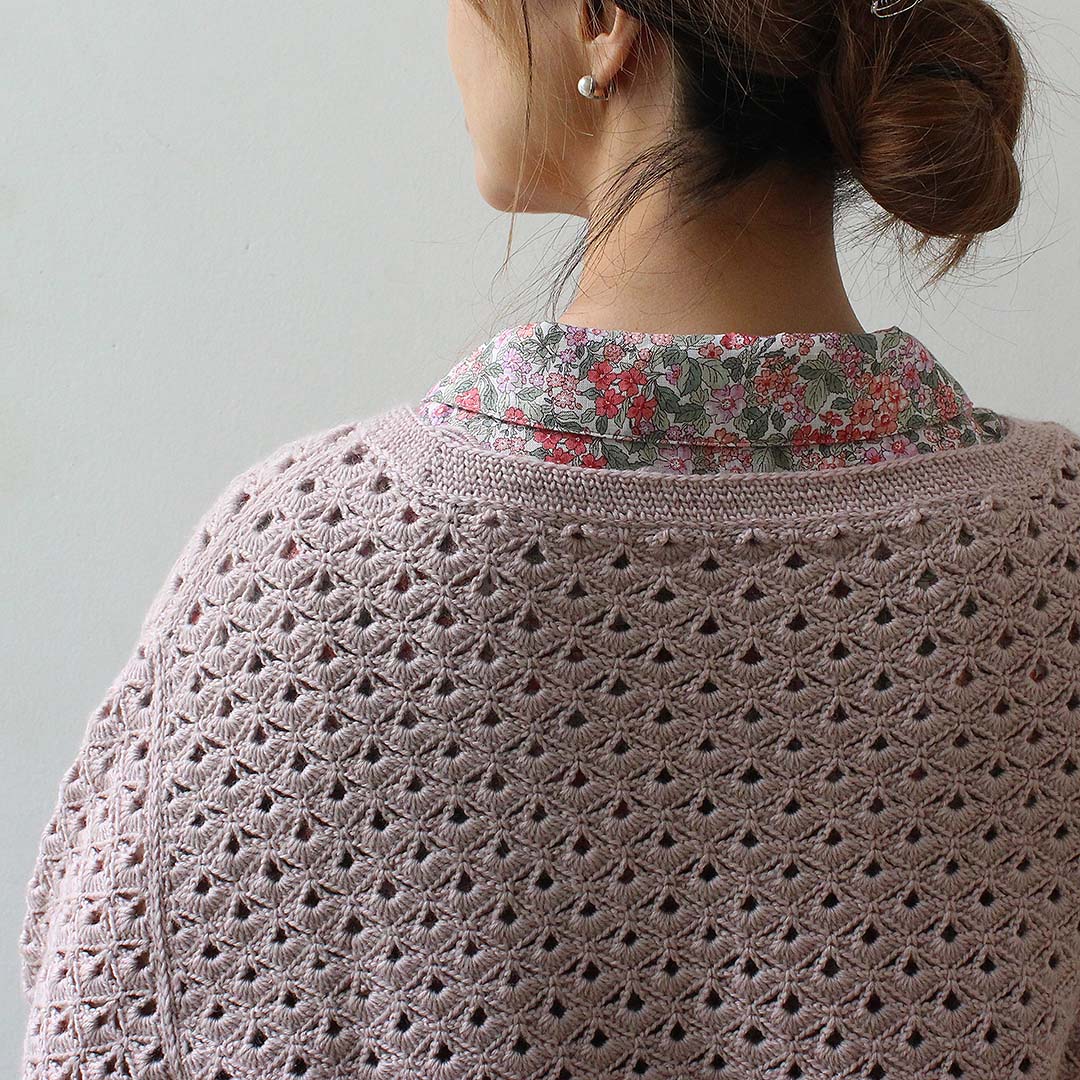 ウロコが並んだような地模様の、かぎ針編みのプルオーバーを編むキットです。