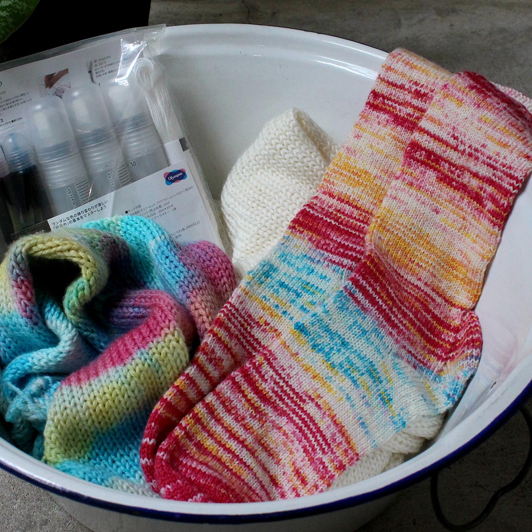 用意するもの:ラップ、中性洗剤、軽量カップ(水を測る際に必要)、バケツなど色止め時にソックブランクを浸けておく容器