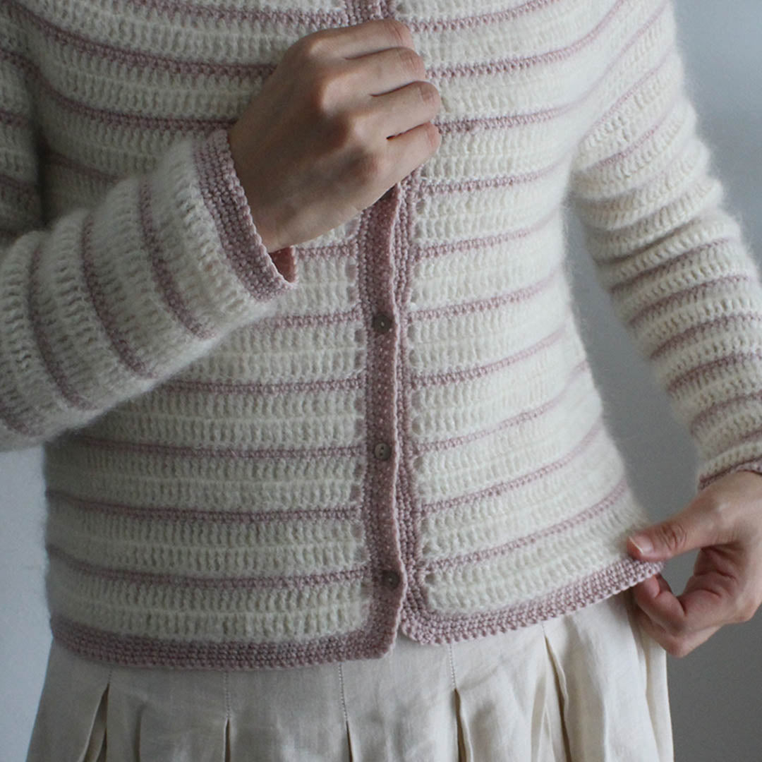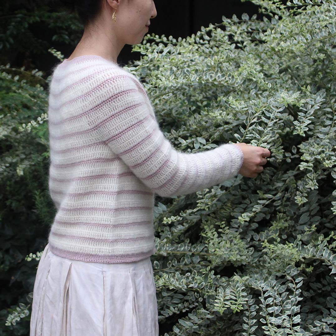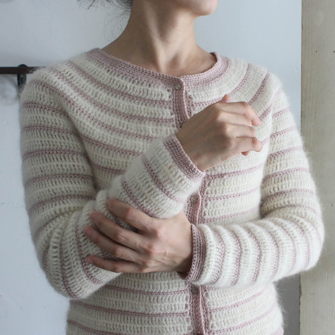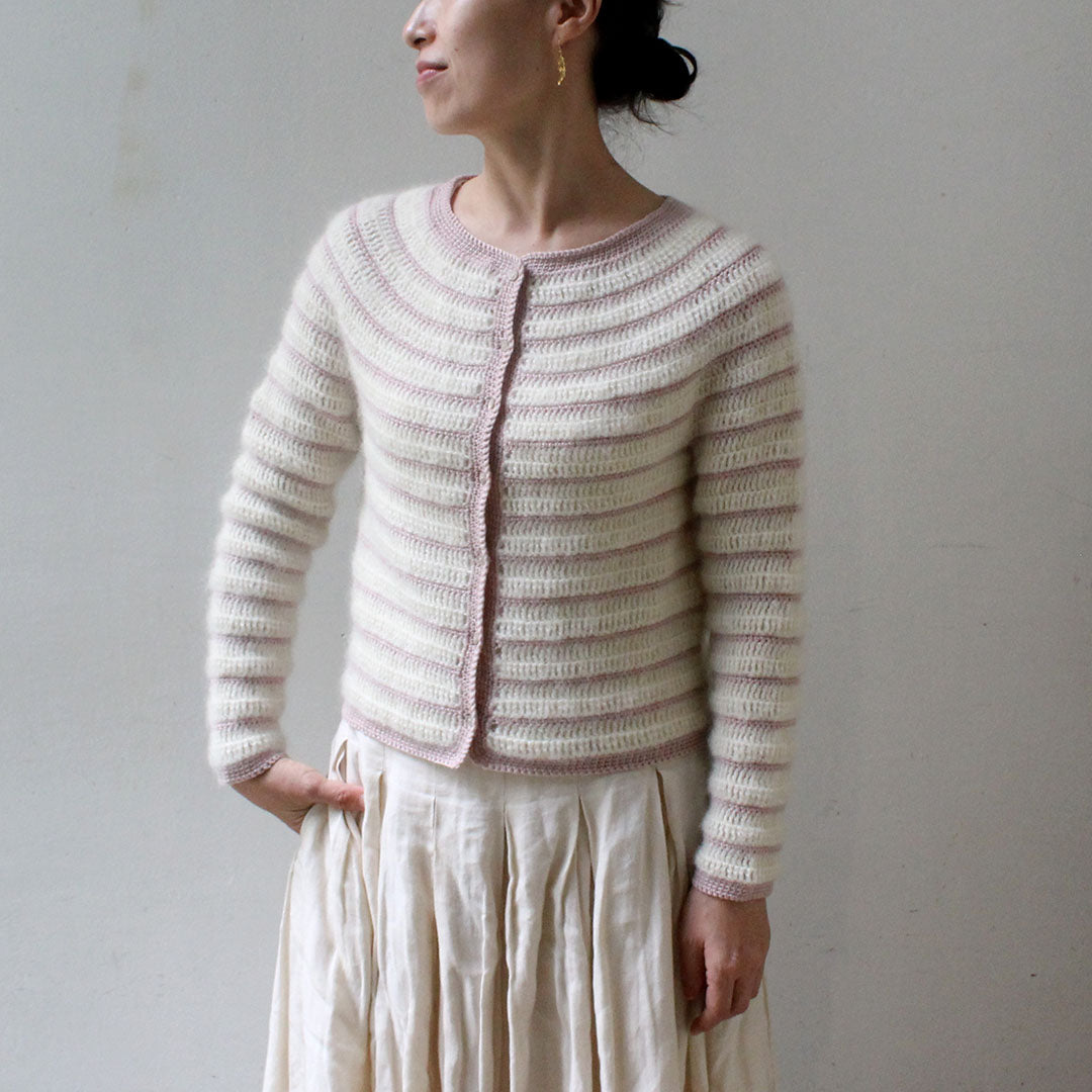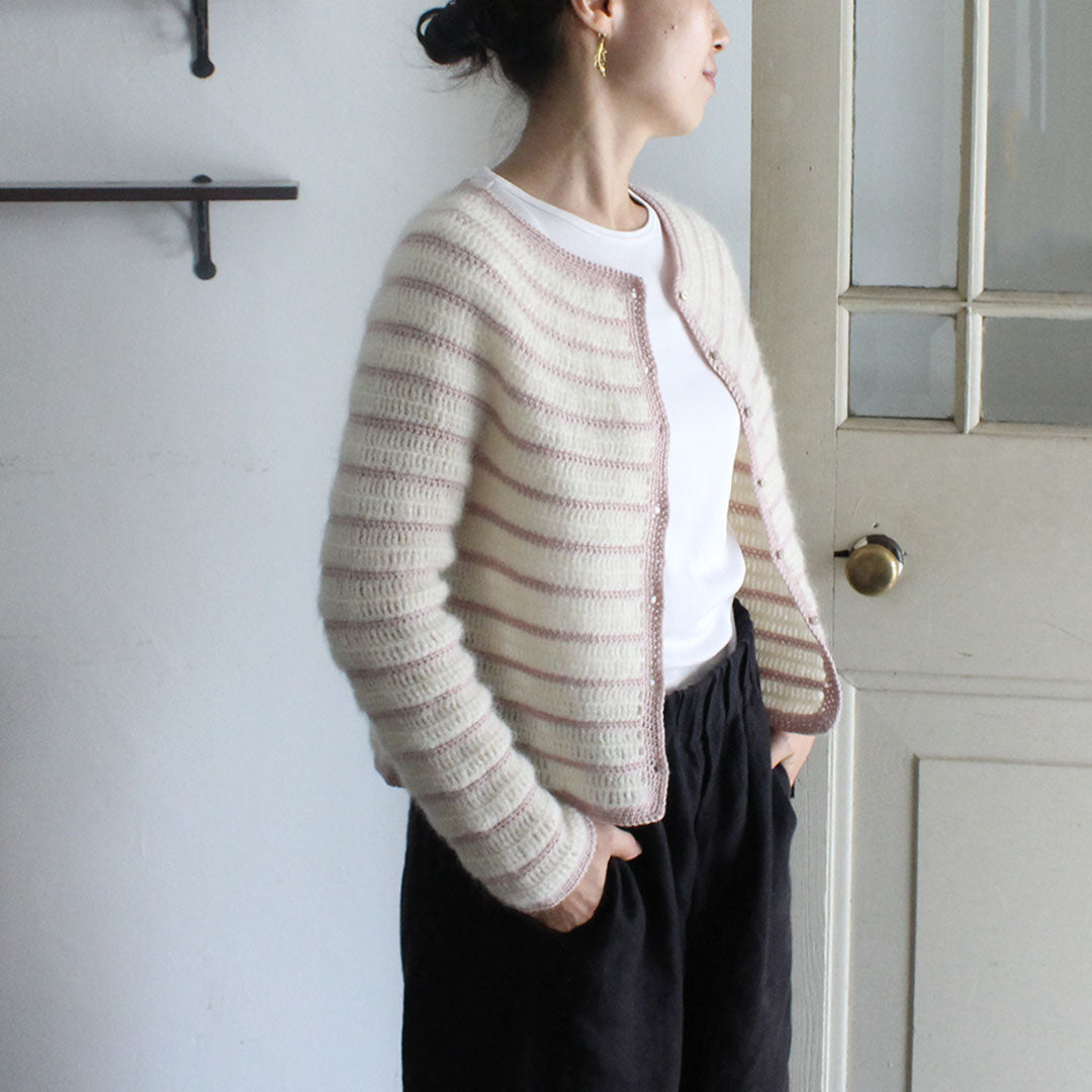 ふわふわ素材のレース糸とオーガニックウールのソックウェイトヤーン、異素材のコントラストをたのしむかぎ針編みのカーディガンキットです。