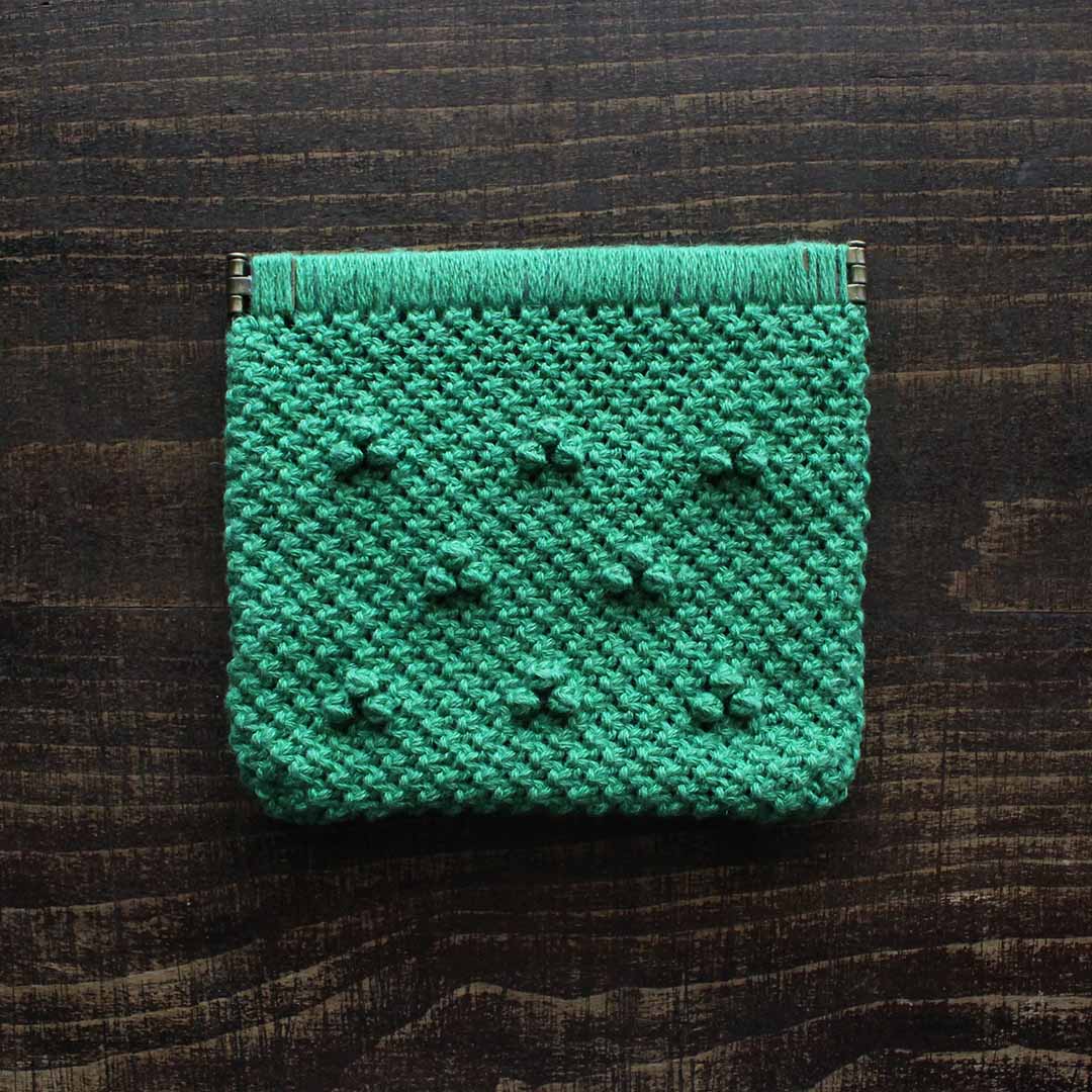 ばね金口をつかった、平結びのポーチは木の実のようなしゃこ結びがアクセント。