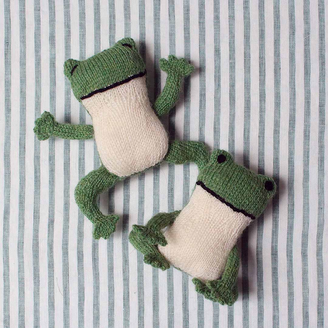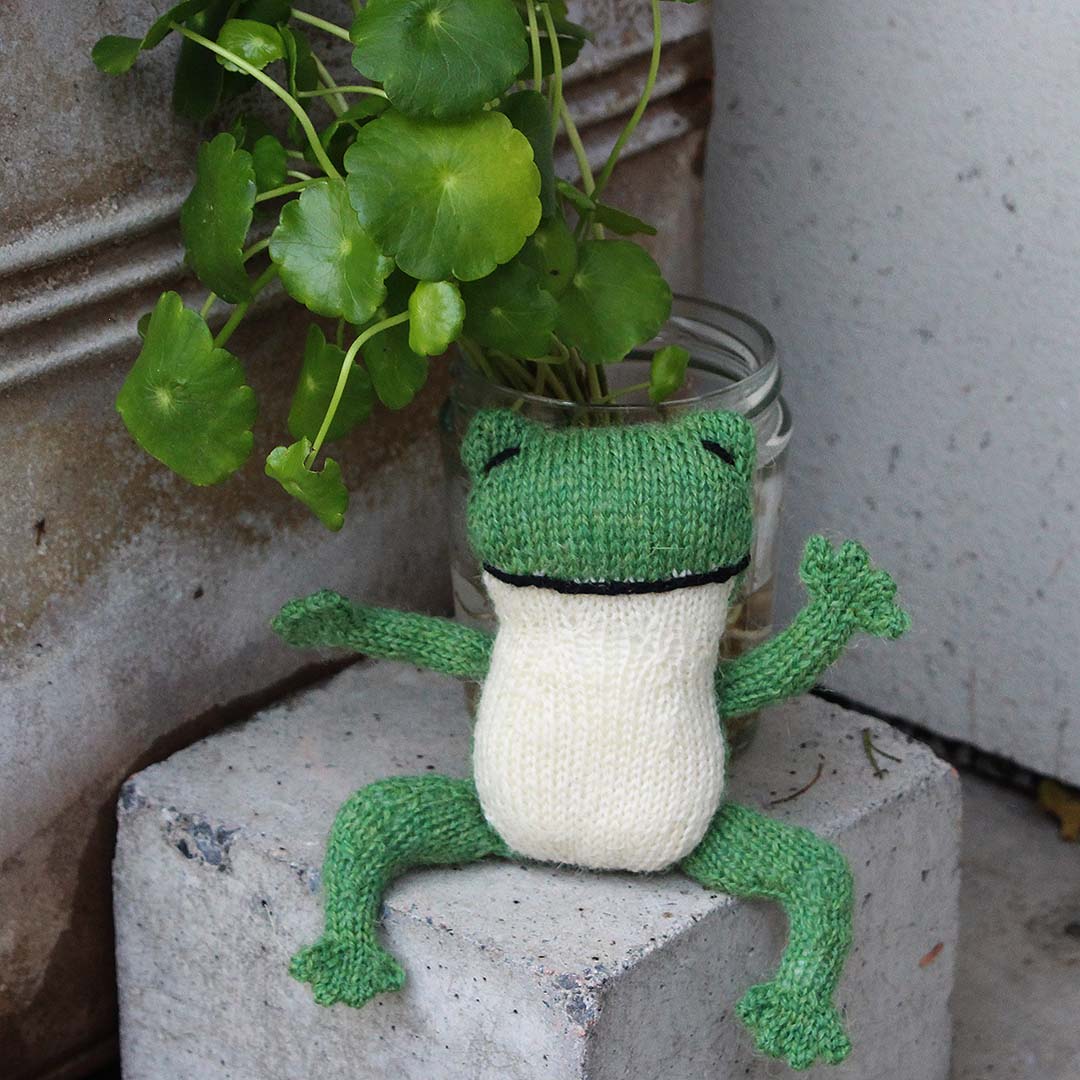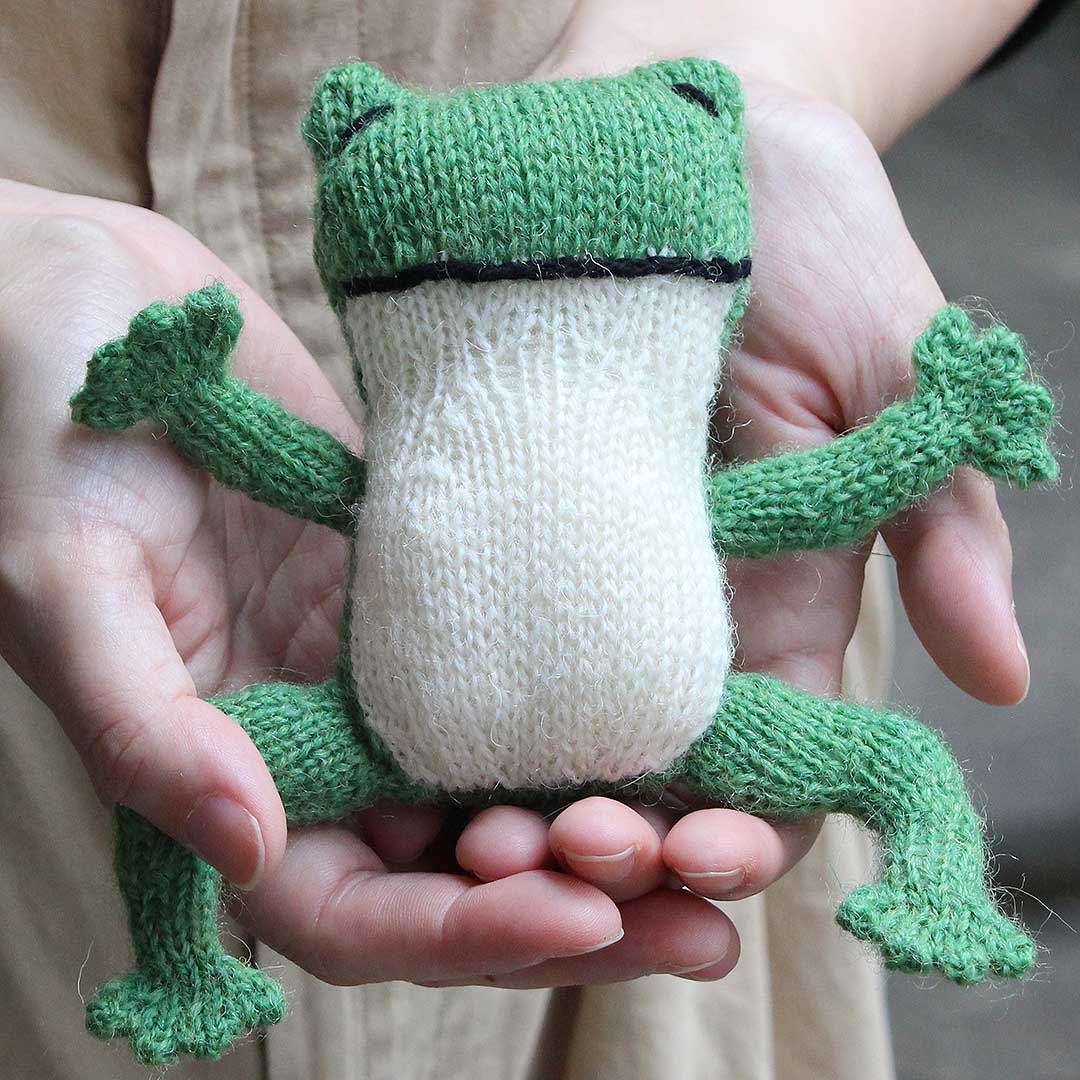 「Tipsy the Frog」は、金森さんお気に入りのかえるのぬいぐるみを、棒針編みでつくる作品として再構築したもの。
