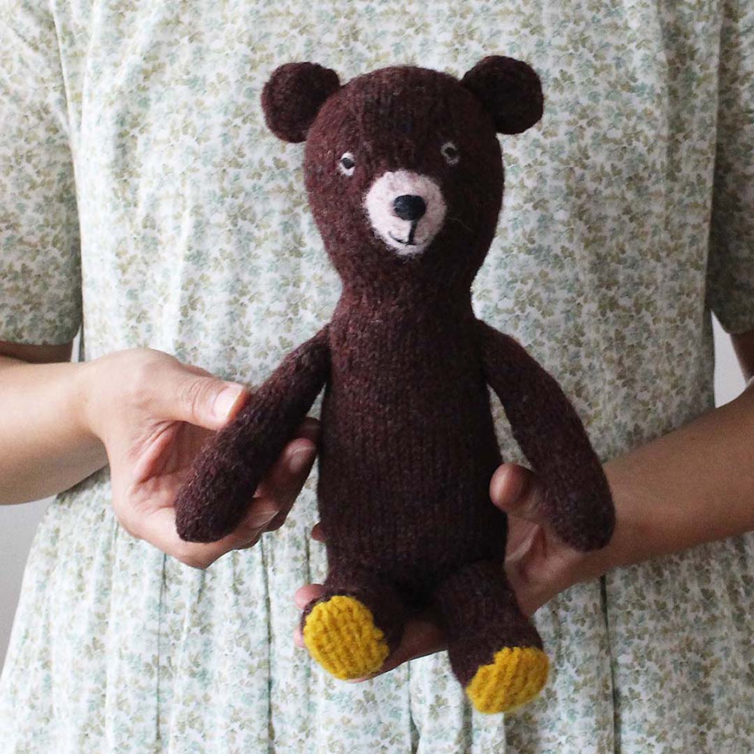 手編みならではの表現を最大限に活かしながら、制作工程にはあみぐるみ、ぬいぐるみ両方の技法を盛り込んで、金森さんデザインの「こぐま」になるよう工夫しています。