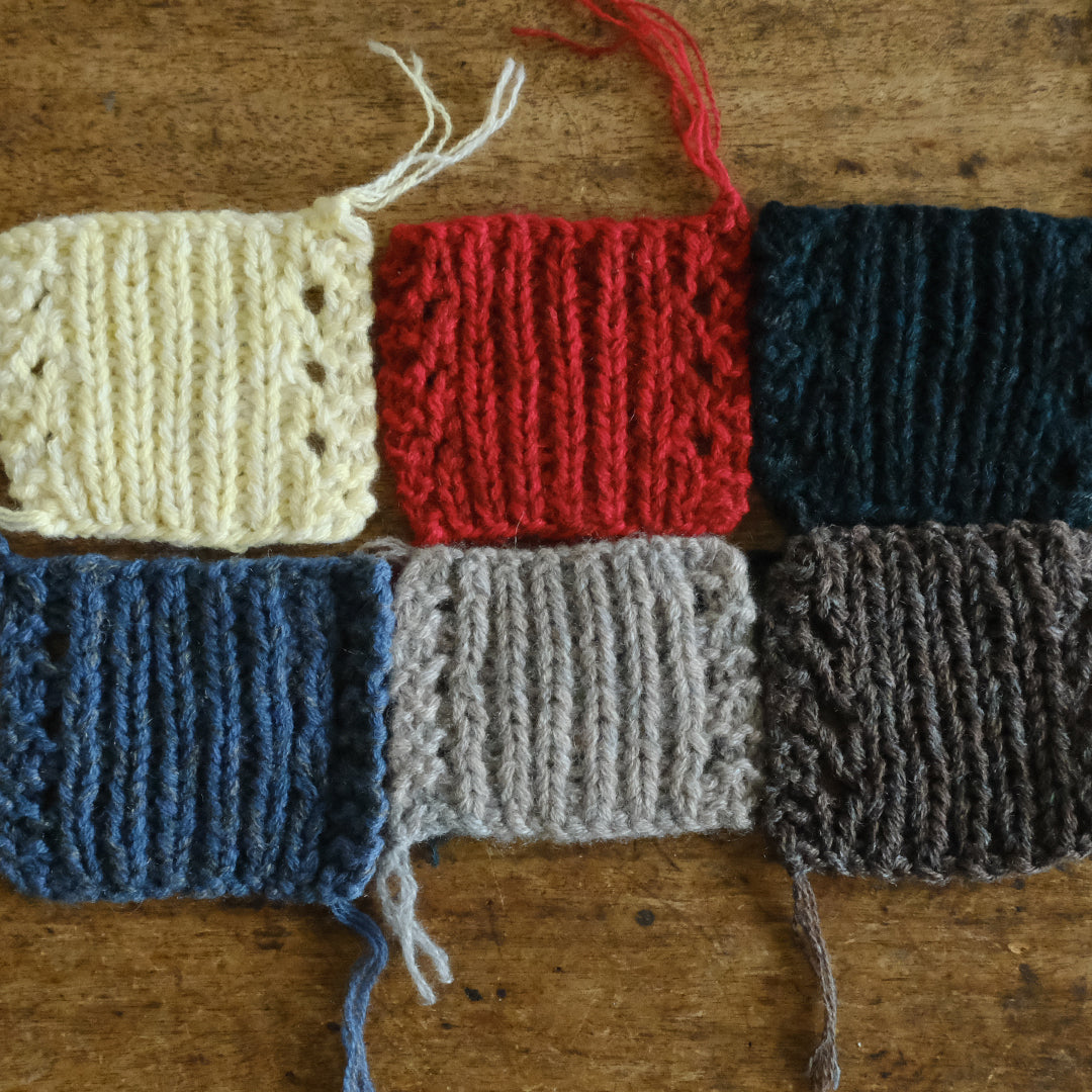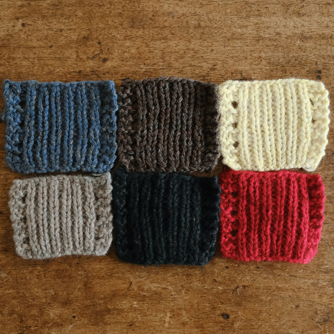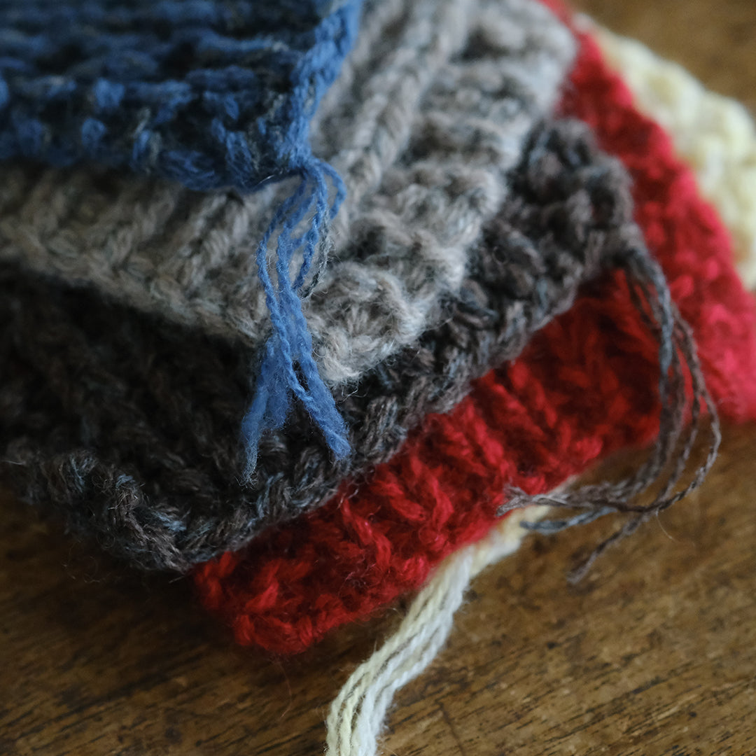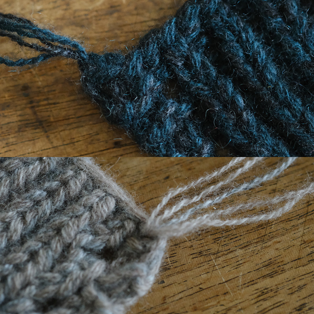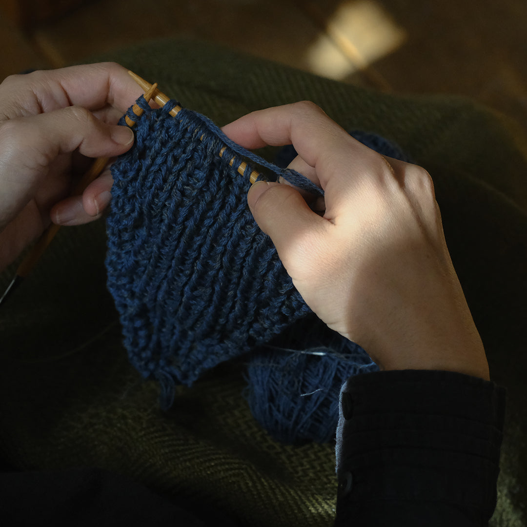 微妙に色の異なる糸を何本も引き揃えて編むことで、手編みならではの奥行きと、ニュアンス豊かな色合いが生まれます。