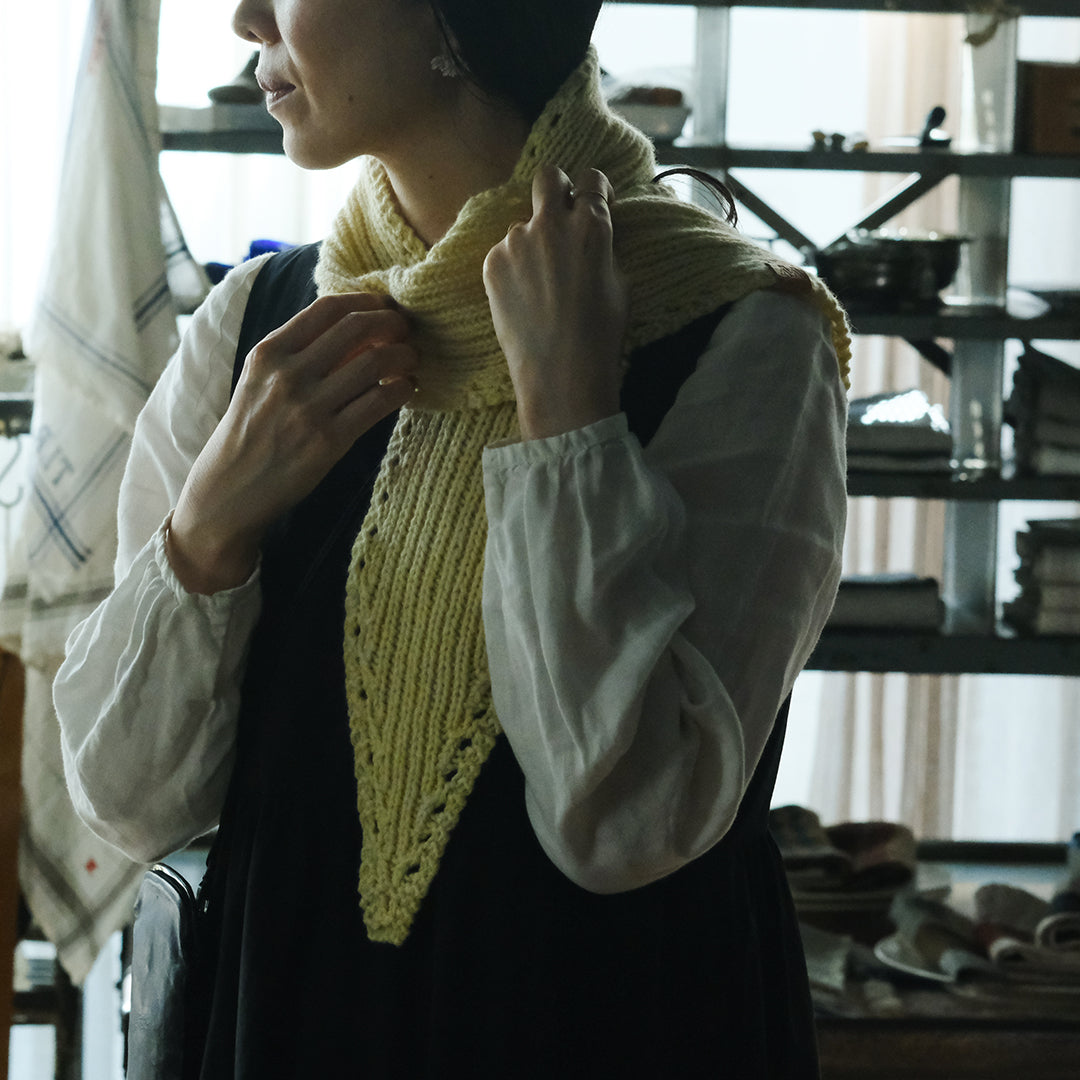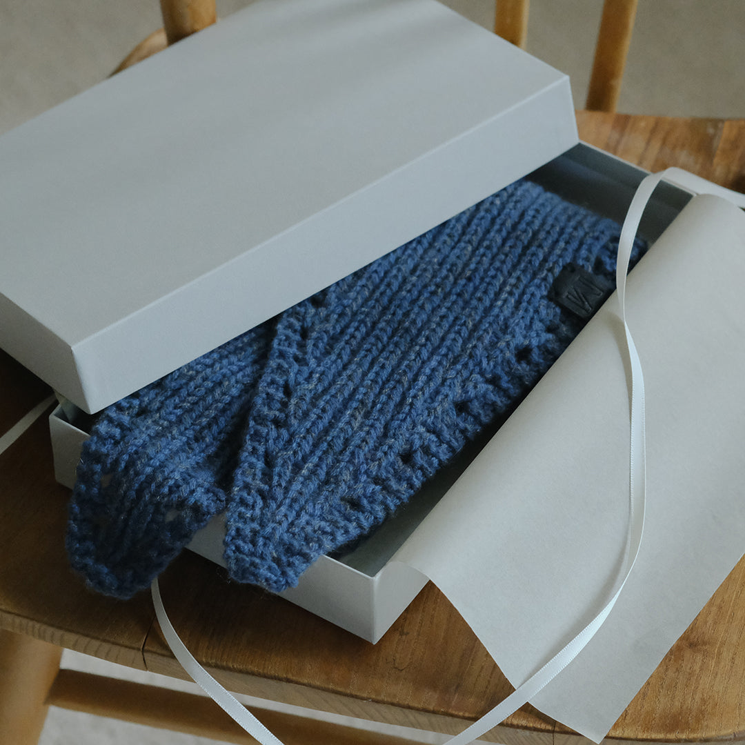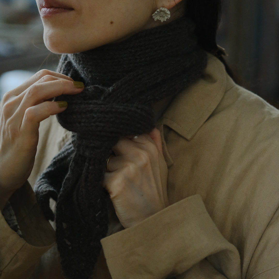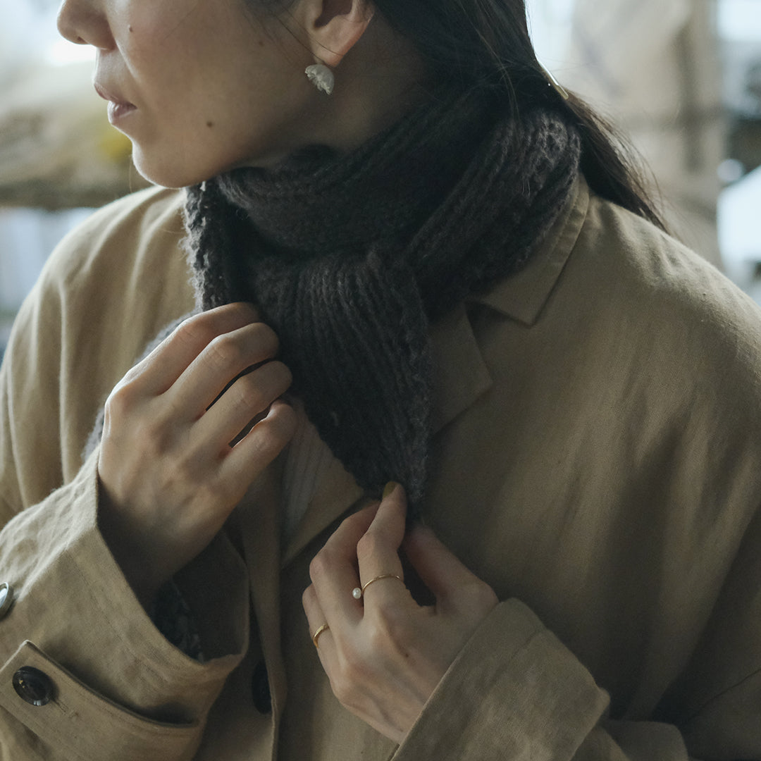 ぬくもりにしあわせを感じるクリスマスシーズンにあわせて、ムーリットがみなさまのためにミニスカーフをおつくりします。素材に選んだのは国産のカシミヤ。選りすぐりの素材の魅力が伝わるよう、ひとつひとつ手編みでお届けします。