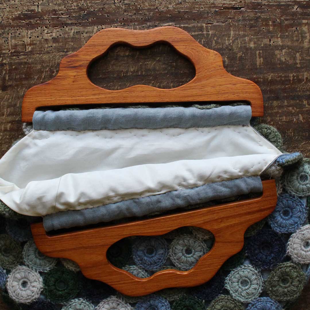 かぎ針編みのモチーフをつなげ、無垢材の持ち手をつけたノスタルジックな雰囲気のバッグをつくるキットです。